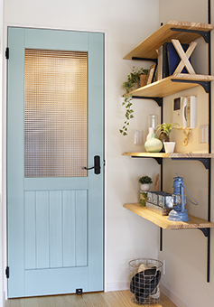 自慢は、自転車の色に合わせてターコイズブルーに塗り上げた木の扉。無垢材の床と打ちっ放しの天井というシンプルな色味のリビングを、よりFさん夫婦らしい空間に演出しています。
