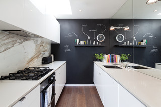 キッチンの壁一面を、ウォールシェルフごとチョークボードペイントに。