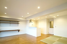 S様夫婦が一番こだわったのは、家族みんなが集うリビングでした。リビングに接していた和室の仕切りをなくし、2人の希望であった広いリビングを実現しました。和室があった部分には畳マットが敷かれており、家族で落ち着いた時間を過ごせる空間となっています。
