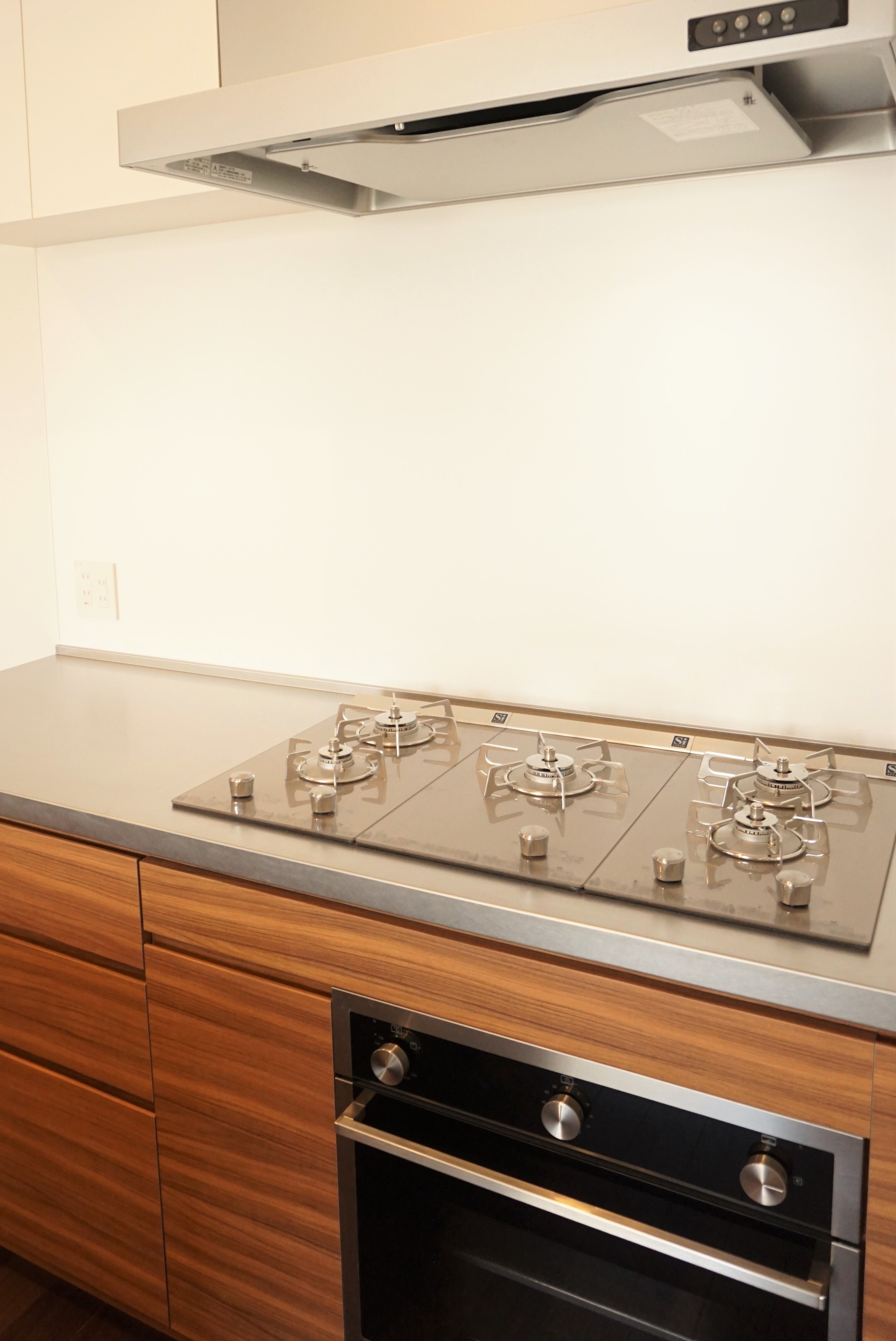 既成のキッチンではフライパンやお鍋がぶつかってしまうことがお悩みだったご主人さま。オーダーキッチンならコンロの寸法に合わせて制作できるので、スペースを充分に確保できます。