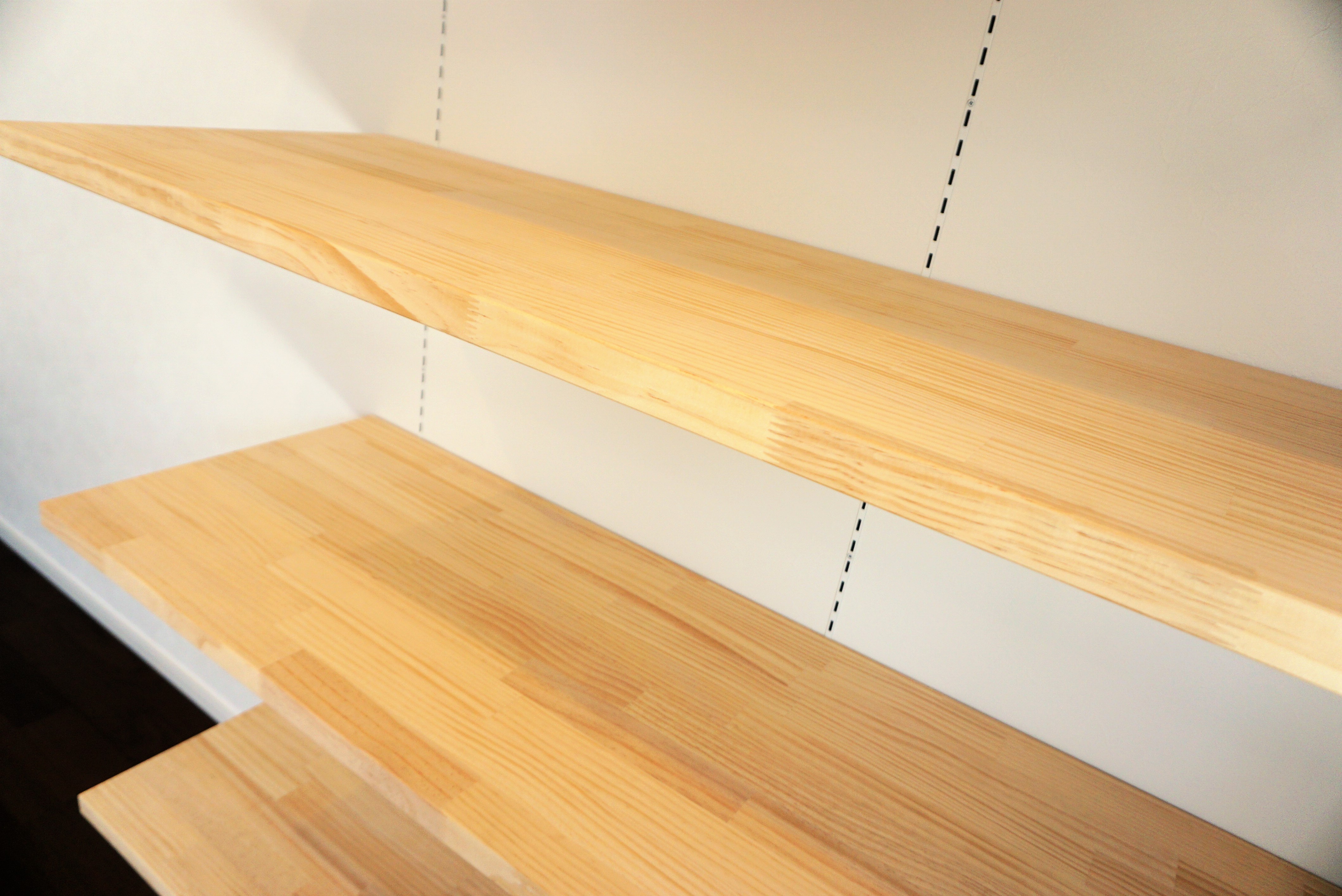 金具は壁のクロスと同系色の塗装とし、さらに壁面に埋め込むことでスッキリとした印象に。無垢材の棚板はあとからDIYで塗装し、色を変える予定だそう。