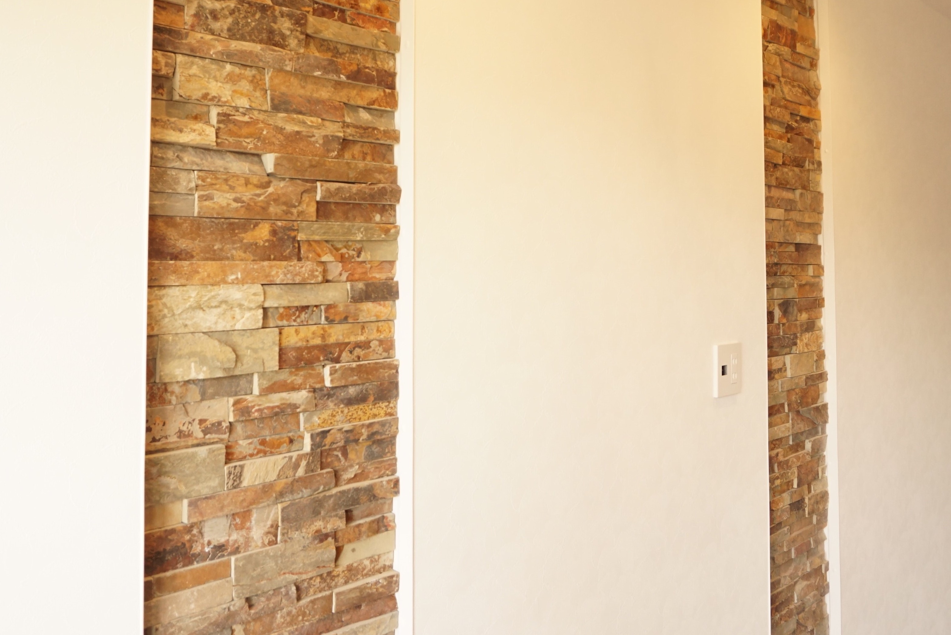 壁掛け予定の大型テレビのちょうど両脇になるよう、ライン上にデザインしました。あえて大きさ・厚み・色が不揃いな石を配置することで、微妙な陰影を表現しています。