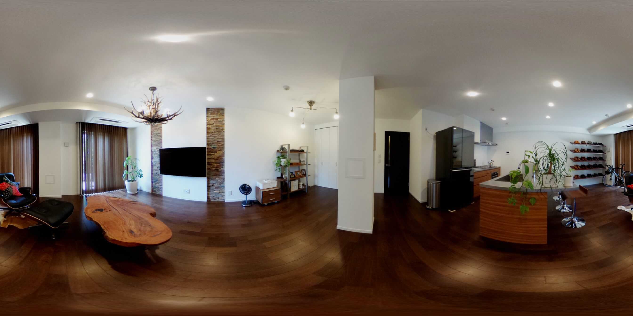 手前にとりつけた大きな鹿角のシャンデリアとの相性もバッチリ!天然素材のワイルドな魅力が、シックな色調のお部屋のアクセントとして際立っています。