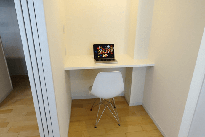 せっかくならこのスペースを有効活用しようということで、考案されたのがワークスペースです。収納を撤去して机を造作することで、読書や仕事など、様々な用途で使用できるスペースとなりました。半個室になっているため、集中した作業ができそうです。