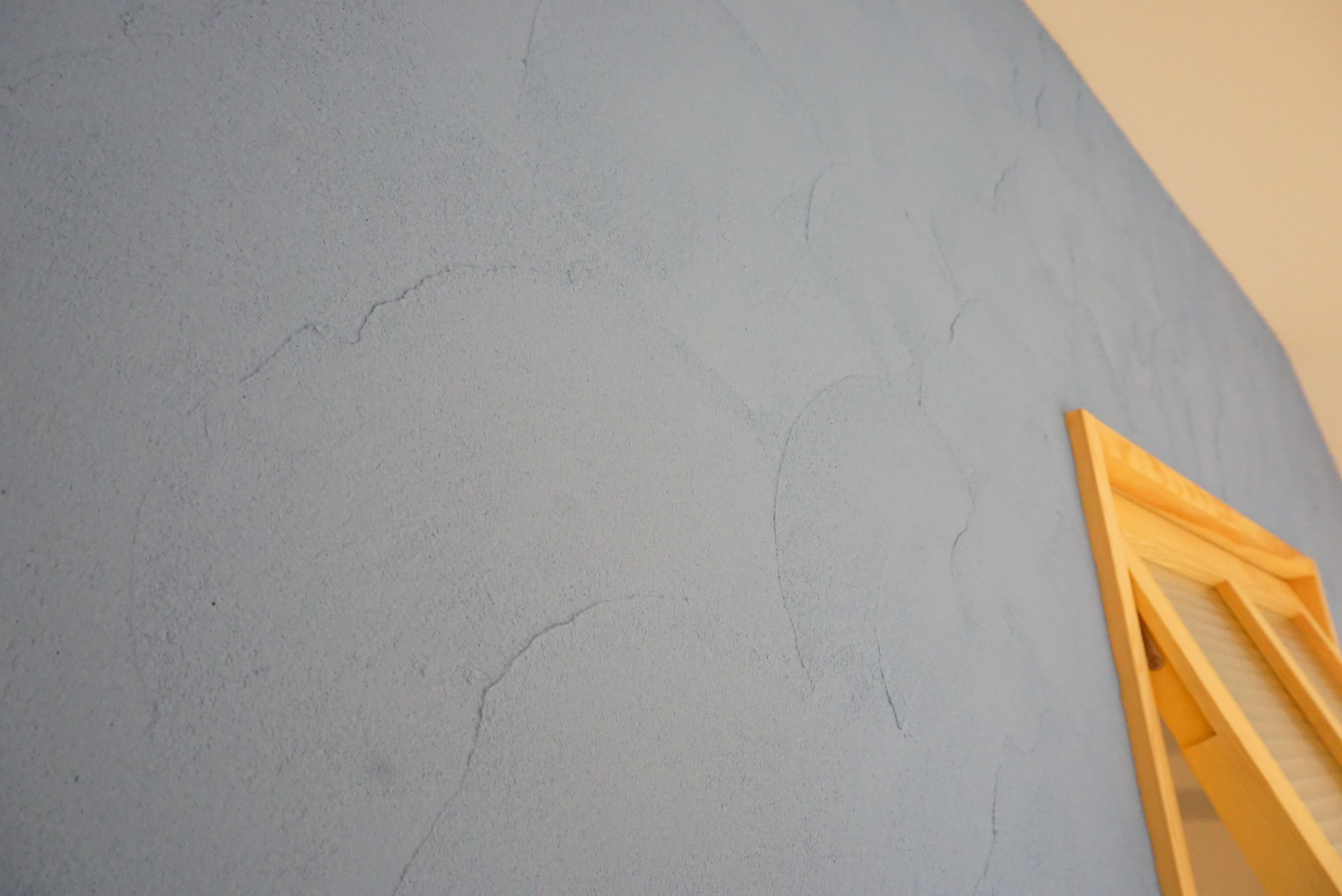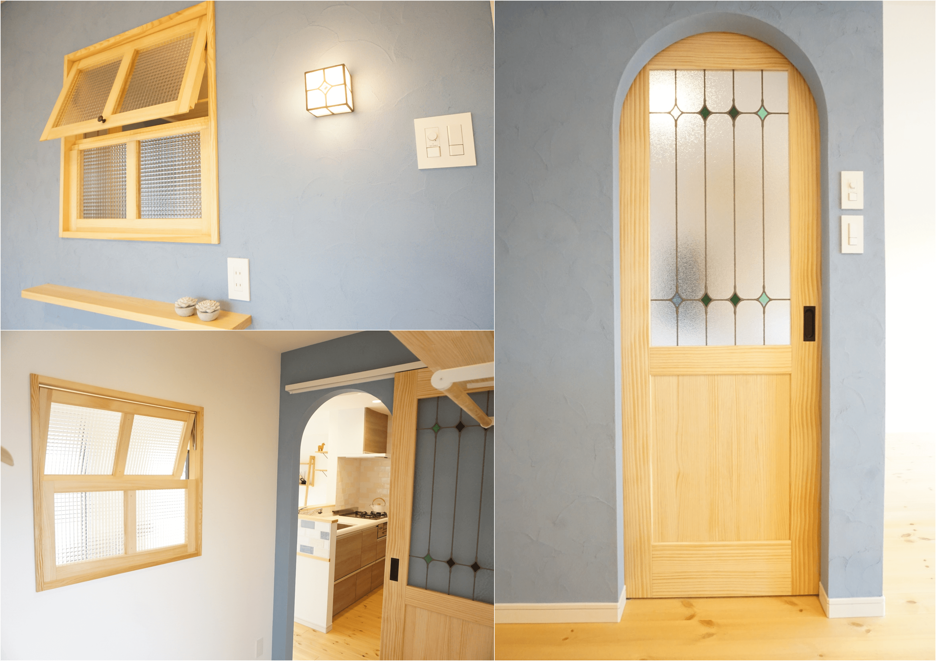 可愛らしい空間を作ろうと取り入れられたアーチ開口は、ブルーの珪藻土で表情が出るようにあえてラフに仕上げ、丸みを際立たせるために内側にスライドドアを取り付けました。床の無垢フローリングとマッチして、家全体に自然素材の持つ優しい空気が流れます。
