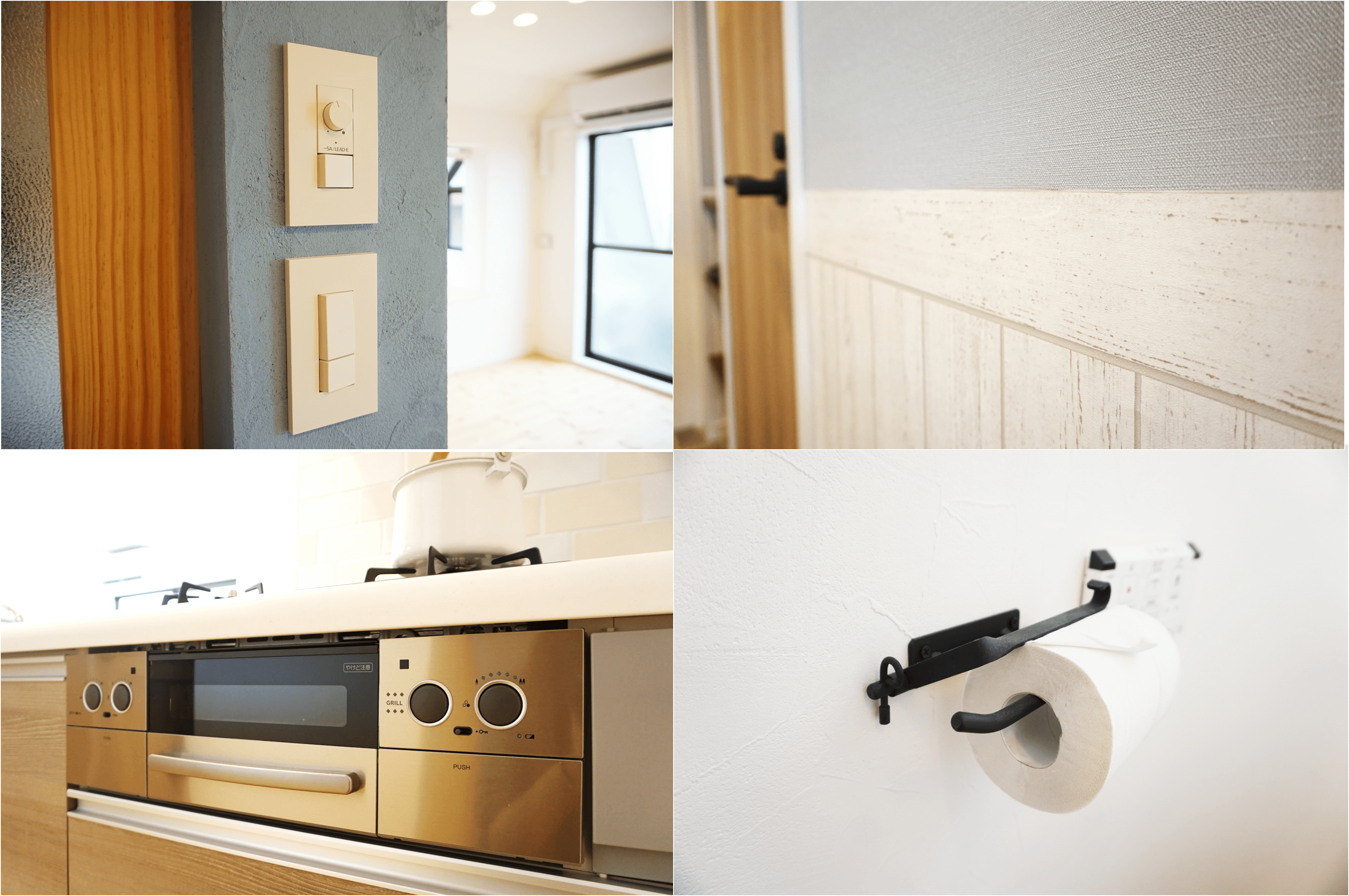 ホワイトの可愛らしいスイッチや、ホルダーに使用されているアイアン素材、ガスコンロのデザインなど、細部まで徹底的にこだわりました。