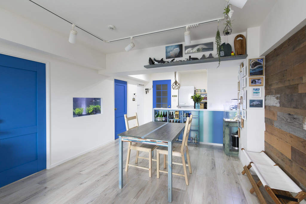 一方で、S様のイメージに合わない内装はデザインを大きく変更。サーフィンが趣味というご主人の「立地は東京だけど、湘南の風を感じたい!」というリクエストをもとに、西海岸風スタイルの内装で、海辺のムードを再現しました。
