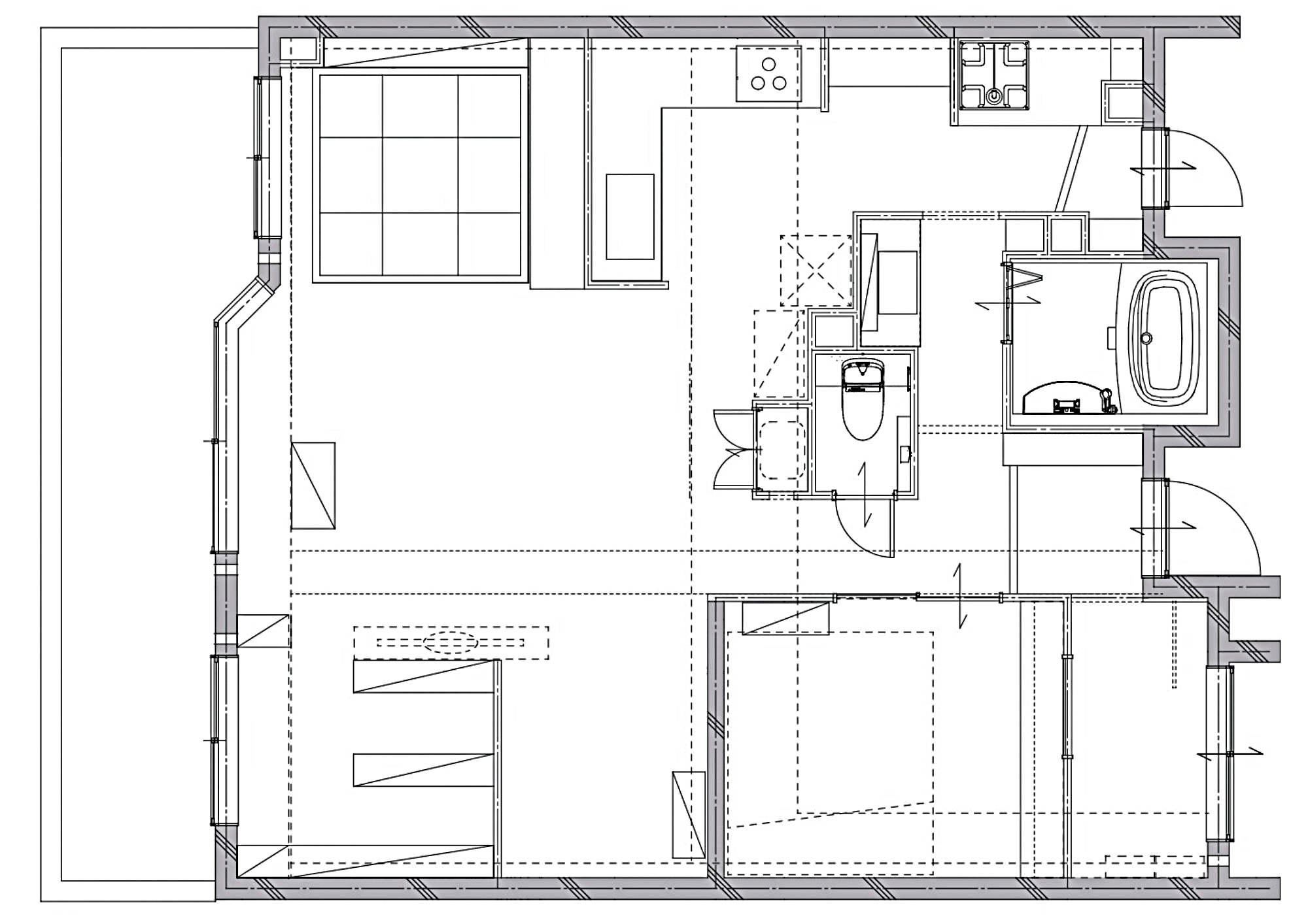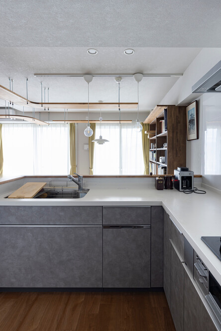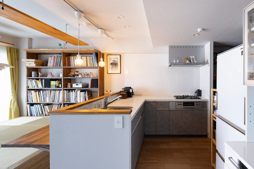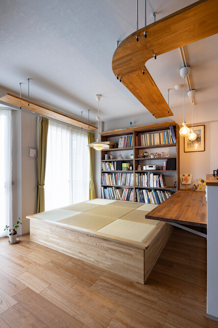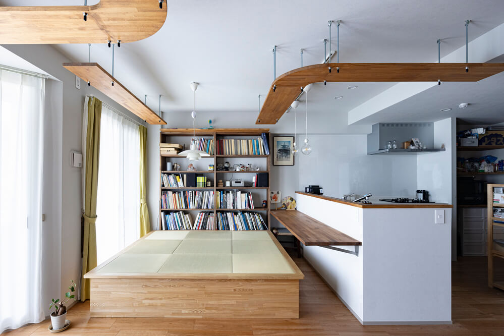 メイン空間はLDK・書斎・防音室が集約した多機能リビング。キッチンはI型からL型にレイアウトを変え、リビング側にカウンターをしつらえて、ダイニングを兼ねるスタイルに。ダイニングチェアは置かずに、小上がり畳を据えました。この小上がり、冬場は中央の畳を上げて掘り炬燵になるオリジナル仕様の造作品。周囲は収納空間になっており、季節もののリネン類などを収めています。