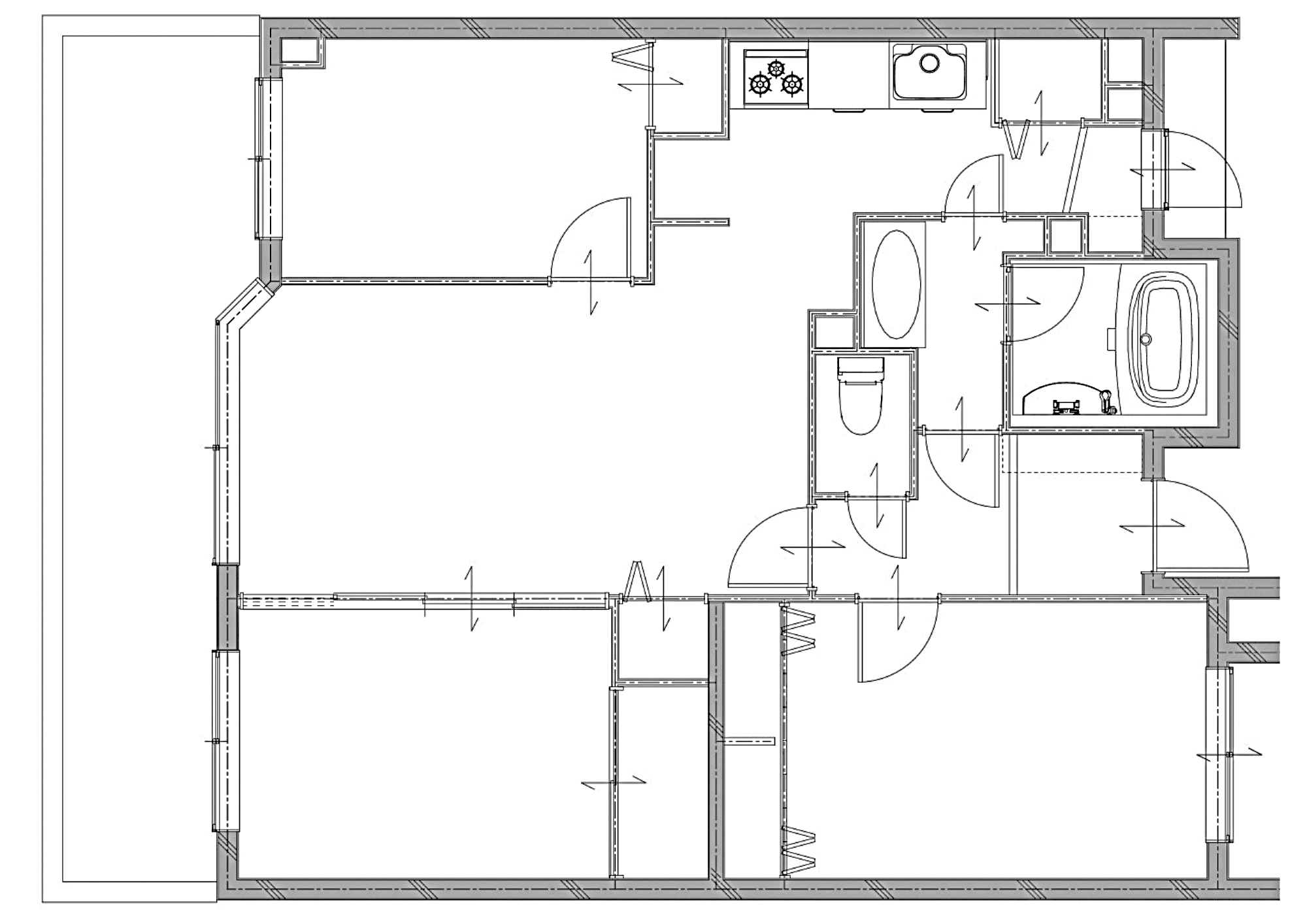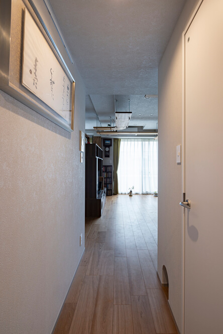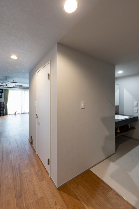 マンションのフルリノベーション事例です。マンションですが勝手口のあるユニークな物件。勝手口からキッチンへ直行できる便利さはそのまま、さらに洗面コーナー/ランドリー/キッチンと、表玄関からもぐるりと回遊できる動線にアップデートしました。