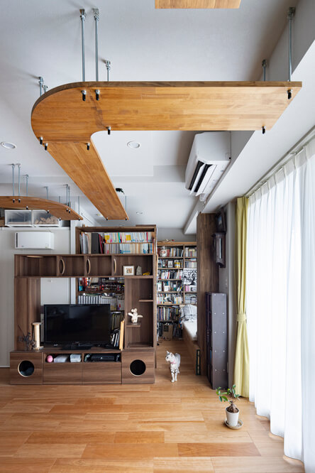 ぐるり動線、キャットウォークと造作本棚の「大人の秘密基地」