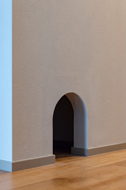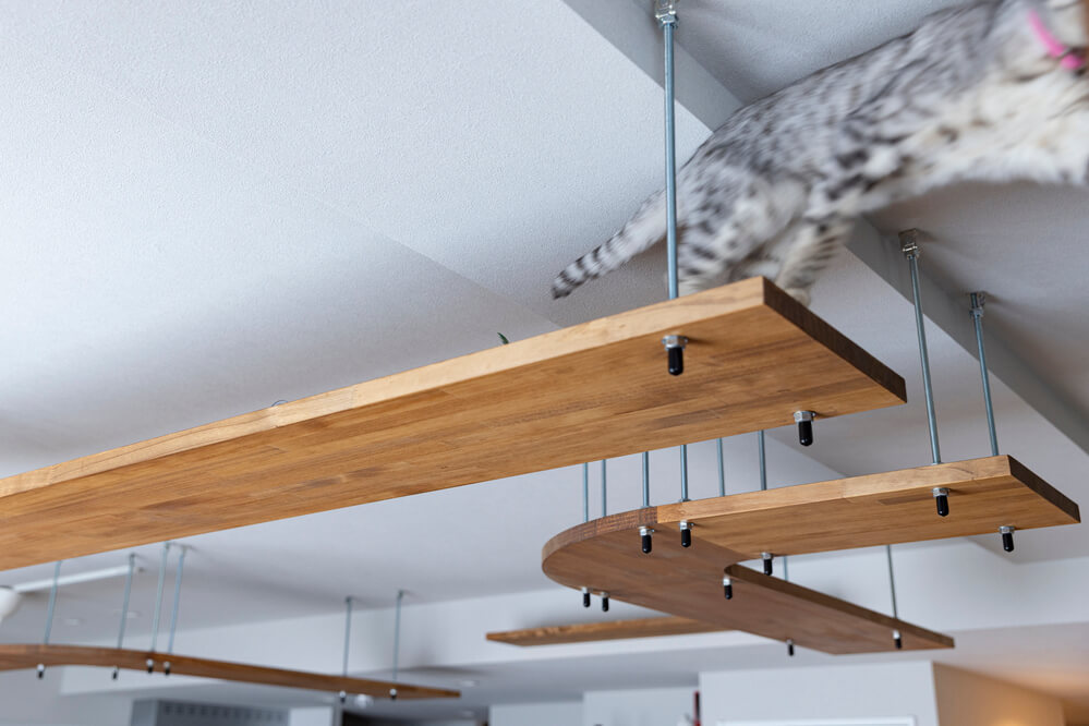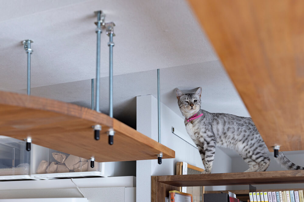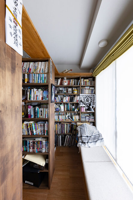 リビングから書斎の天井には、カウンターや棚と同じ樹種・同じ塗装の木材で、猫ちゃんのためのキャットウォークをしつらえました。書斎には、三列構成の本棚に蔵書がぎっしり。この造作本棚も、キャットウォークの一部として計画しています。書斎の窓辺にはベンチを造作し、ヌック(小さなくつろぎスペース)に。飼主さんと猫ちゃんと、一緒に日向ぼっこをするのにちょうどよい「おこもり感」ある小空間です。