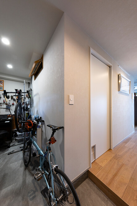 書斎の隣の白い扉は、置き型のピアノ演奏用防音室。置き型防音室も近年はさまざまなサイズや楽器に対応した製品が発売されていますが、サイズが大きくなればなるほどスペースの確保が課題となります。本件では、リビングに面した本棚と、防音室を設置した際のラインをピッタリ揃えることで、圧迫感のない空間設計を実現しています。
