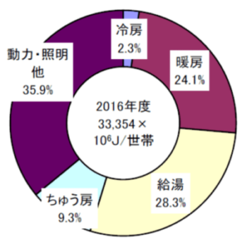 住宅の中でエネルギーを使うものとしては、冷暖房や給湯、照明、生活家電などがあげられます。とくに冷暖房は、家庭のエネルギー消費の約3割を占めており、多くのエネルギーを消費していることがわかります。