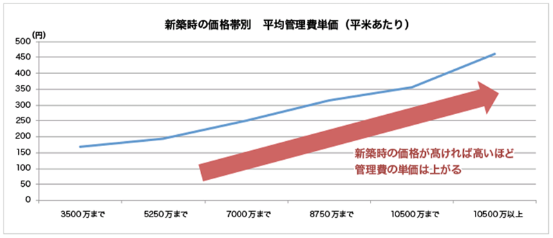 下のグラフは、スタイルアクト社の調査の結果を図解したもので、物件価格(新築時の分譲価格)と管理費の相関関係を表しています。わかりやすいよう、一戸70㎡として戸当たりに換算しました。