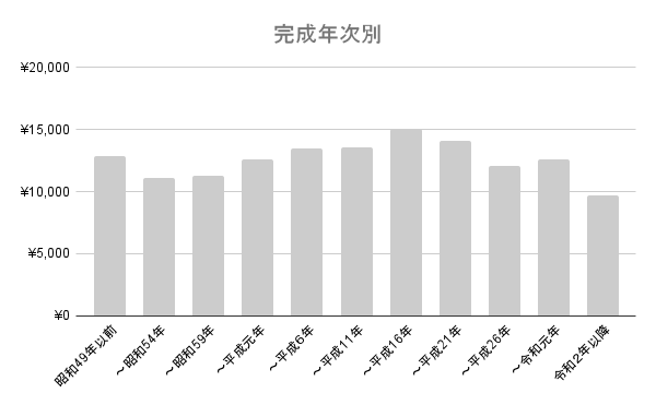 下のグラフは、築年数と修繕積立金の金額の相関関係を表したもの。令和2年以降築の物件が突出して安く、1万円を切っていますね。その理由は、多くのマンションで築年数が経つにつれて修繕積立金を値上げする「漸増(ぜんぞう)式」が採用されているため。