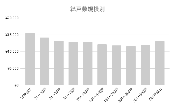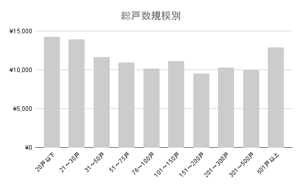 下記のグラフは、戸数別・一戸当たりの管理費の比較。戸数が多いほど、一戸当たりの管理費は安くなっていますね。